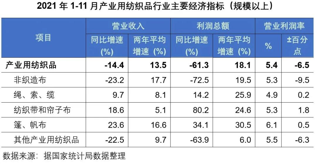 經濟效益方面,1-11月產業用紡織品行業規模以上企業的營業收入同比下降14.4%,兩年平均增長13.5%,利潤總額同比下降61.3%,兩年平均增長18.1%,營業利潤率為5.4%,同比下降6.5個百分點。分領域看,非織造布行業的營業收入和利潤總額分別同比下降23.2%和72.5%,營業利潤率為5.3%,較上年同期下降9.5個百分點;繩、索、纜行業的營業收入和利潤總額分別同比增長9.7%和14.2%,營業利潤率為4.9%,同比增加0.2個百分點;紡織帶和簾子布市場延續了良好的發展勢頭,營業收入和利潤總額分別同比增長18.6%和80.2%,營業利潤率達到5.3%,同比增長1.8個百分點;篷、帆布的營業收入和利潤總額分別同比增長23.6%和34.1%,6.1%的營業利潤率為行業最高;醫療衛生、過濾、土工用紡織品所在的其他產業用紡織品的營業收入和利潤總額分別同比下降22.5%和63.9%,營業利潤率為5.5%,同比下降6.3個百分點。