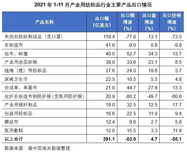 國際貿易方面,根據中國海關數據,2021年1-11月我國產業用紡織品主要出口產品(按出口金額排名前十二類產品)的出口額為391.1億美元,同比下降53.0%。分產品來看,未列名紡織制成品(主要為口罩)目前是行業最大的出口產品,但因國外對口罩需求的大幅回落其出口額已較上年同期下降了77.0%,出口均價同比下降73.5%;氈布/帳篷、產業用涂層織物等傳統產品的出口額分別同比增長52.7%和33.6%,出口均價分別同比增長13.7%和8.5%;合成革及革基布的出口額同比增長44.7%,出口均價同比增長13.3%。非織造布及相關制品的出口呈現不同走勢,卷材出口41.6億美元,同比下降9.0%,出口量126.0萬噸,同比小幅上漲0.8%,出口均價同比下滑9.8%;化纖非織造布制防護服(含醫用防護服)出口20.9億美元,同比下降80.2%,出口均價同比大幅下降60.6%;一次性衛生用品出口22.5億美元,同比增長10.5%,出口均價同比增長4.8%。從整體看,價格是影響我國產業用紡織品出口增速的主要因素。