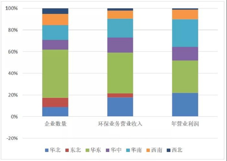 統計范圍內有約45%的企業集聚于華東地區,該地區貢獻了全國38%的環保營收,吸納了37%的從業人員。其次為華南地區,以14%的企業數量占比貢獻了18%的環保營收,吸納了19%的從業人員。華北、華中、華南地區人均營業收入均高于全國平均值(105.2萬元/人)。華東、西南、西北、東北地區則低于全國平均水平。2020年數據顯示,廣東、北京、湖北、浙江、江蘇、山東6 ?。ㄊ校┢髽I營收總額均超過 1000 億元,6 省(市)環保企業營收總額,占全國的占比超過了 2/3。長江經濟帶 11 ?。ㄊ校┮?36.7%的企業數量占比貢獻了近一半的產業營收。