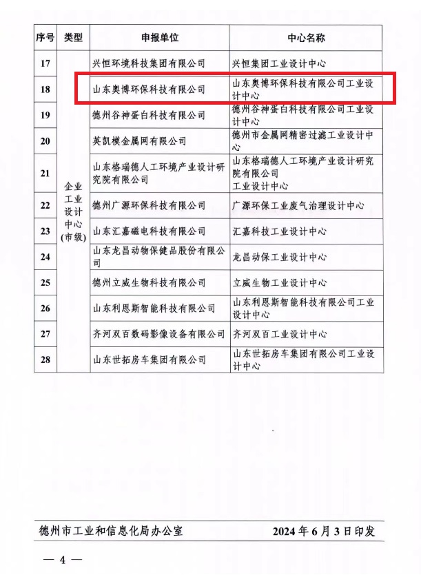 近日,德州市工業和信息化局公布德州市市級工業設計中心的企業名單,我司申報的工業設計中心【山東奧博環??萍加邢薰竟I設計中心】成功入選!