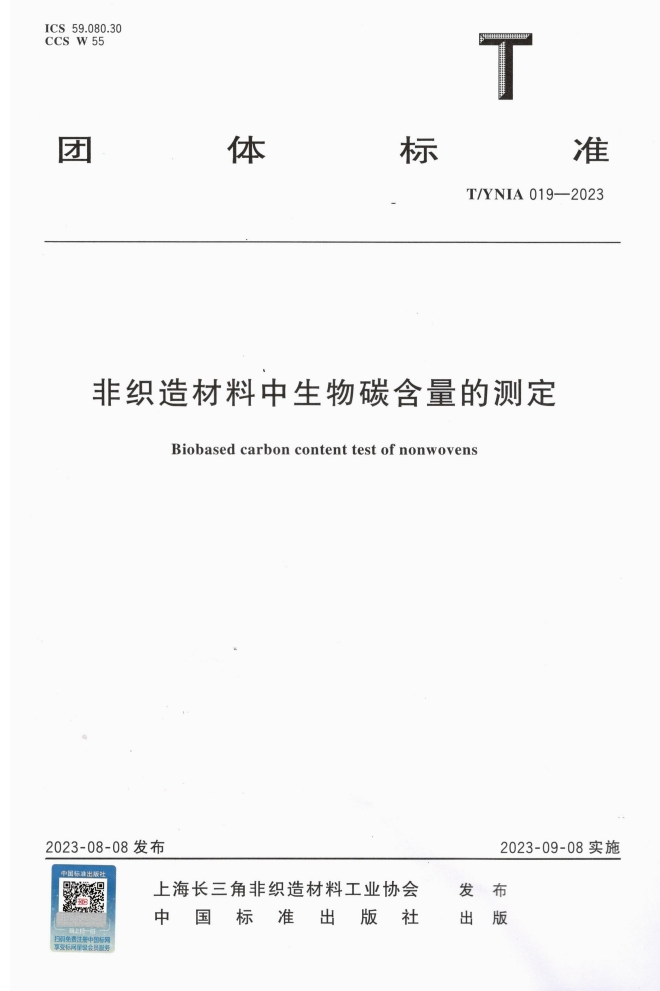 團(tuán)體標(biāo)準(zhǔn)T/YNIA 019-2023《非織造材料中生物碳含量的測(cè)定》,由上海長(zhǎng)三角非織造材料工業(yè)協(xié)會(huì)發(fā)布,山東奧博環(huán)保科技有限公司為主要起草和完成單位。